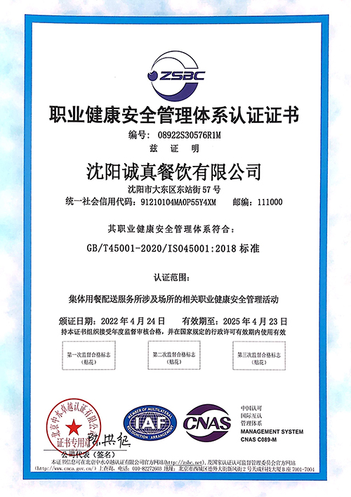 職業健康安全管理體系認證證書
